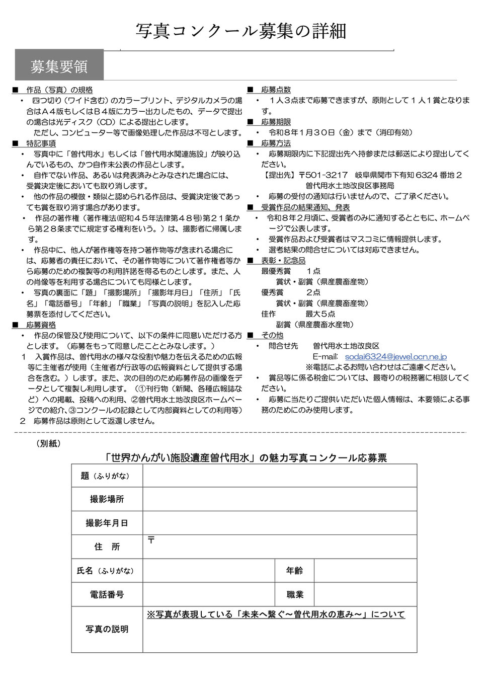 2025/03/27 世界かんがい施設遺産登録10周年記念写真コンクールの開催 写真コンクール応募票(HP用) ダウンロードして出力しご記入下さい 写真コンクール応募票(HP用).docx Microsoft Word 19.4 KB ダウンロード tagPlaceholderカテゴリ: